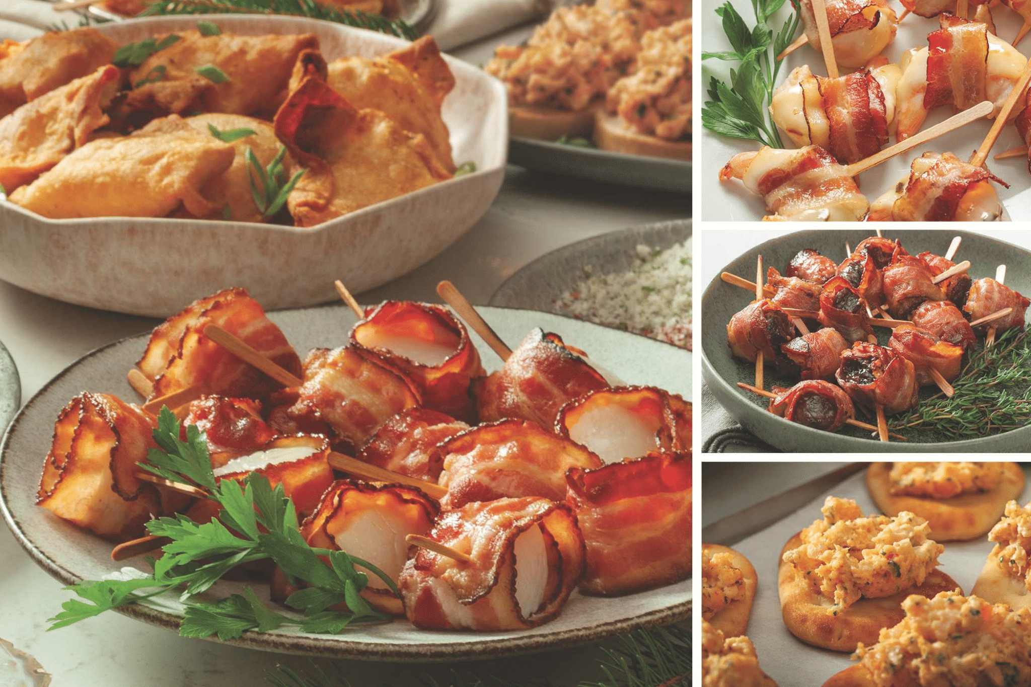 small gathering of guests, these bundles have everything you need to take your Game Day snacks to the next level.The Big Game Bundle features a dozen each of Bacon-Wrapped Scallops, Bacon-Wrapped Shrimp with Pepper Jack Cheese, and Bacon-Wrapped Tenderloin, (seeing a theme here :), 24 of the best Crab Rangoons you’ve ever tasted, 24 Lobster Crostinis, and 20 Shrimp Flatbreads. All are ready to pop into the oven for 25 minutes or less. Serves 12-14.